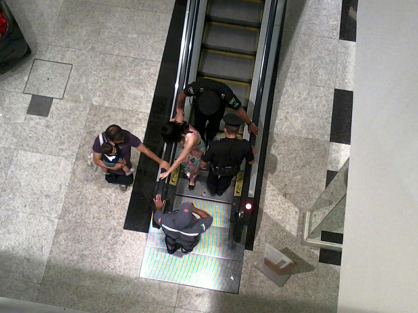 | Em um shopping do bairro Candelária uma jovem senhora ficou com seu vestido preso na escada rolante. Equipes de socorro do shopping prestam atendimento à senhora. |