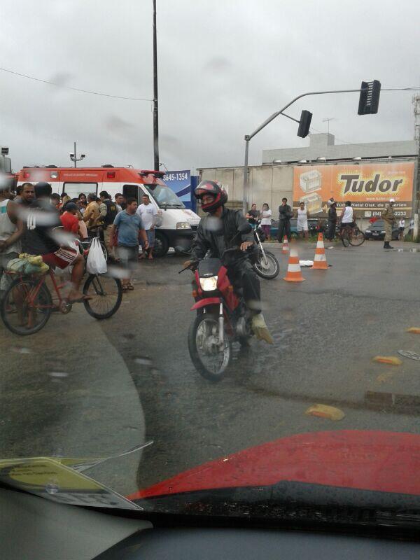 | Um acidente entre um caminhão e uma moto deixou um pai morto ( motociclista), e o filho ferido (garupa), na rodovia BR-101 x av. Edgard Dantas em Parnamirim. Trânsito bloqueado sentido Natal |