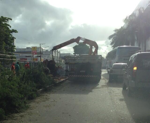 Depois de tombamento de árvore na av. Bernardo Vieira o trânsito foi liberado. Apenas o caminhão da SEMSUR retira o tronco e galhos do canteiro central. Foto Thaisa Galvão
