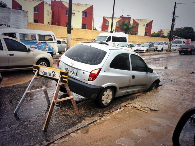 Carro caiu em buraco da CAERN na av. Abel Cabral x av. Ayrton Senna