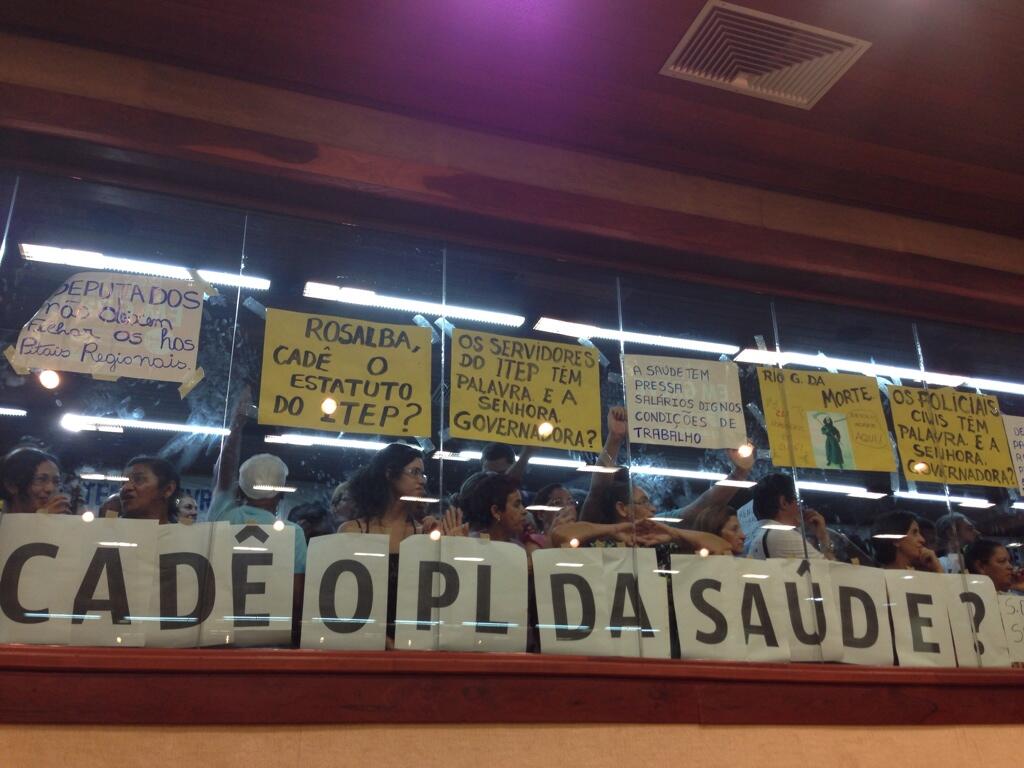 Manifestantes estão nas galerias da Assembleia Legislativa em protesto contra a governadora Rosalba Ciarline que fez mensagem anual. Manifestantes realizaram um protesto em frente à assembleia e no plenário, Tácio Cavalcanti / Agora Vai