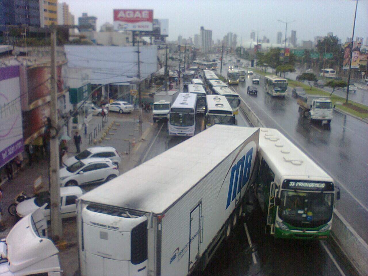 Na pista local da rodovia BR-101 uma carreta que fazia manobras foi atingida por um ônibus em sua traseira. Tráfego interrompido pela pista local no sentido aeroporto. Usem pista expressa . Fotos: Junior Senna/AYRANN WESKLER Via Certa Natal