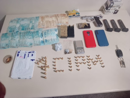 Durante o procedimento, foram localizados uma pistola, calibre 380, três carregadores, 133 munições nos calibres 380 e 38, além de R$ 5.500,00 em espécie e drogas.